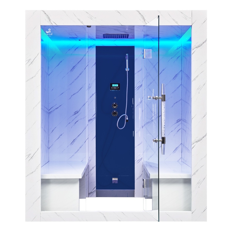 Son design met en valeur une façade vitrée en verre trempé de 10 mm, complétée par une porte de 8 mm. La transparence du verre et la finition blanc marbré des panneaux créent une esthétique contemporaine qui s’intègre parfaitement dans un intérieur moderne, tout en restituant l’atmosphère chaleureuse et enveloppante d’un hammam véritable.