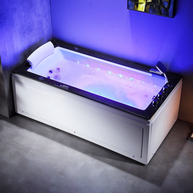 La LORD MAX BLACK Droite intègre un ozonateur, un panneau tactile, la connexion Bluetooth® et radio FM, un coussin ergonomique et une robinetterie en laiton massif chromé avec bec cascade inox. Livrée avec deux tabliers (un court et un long), elle est prête à raccorder sur installation monophasée 220 V (16 A), conforme aux normes CE et TUV.