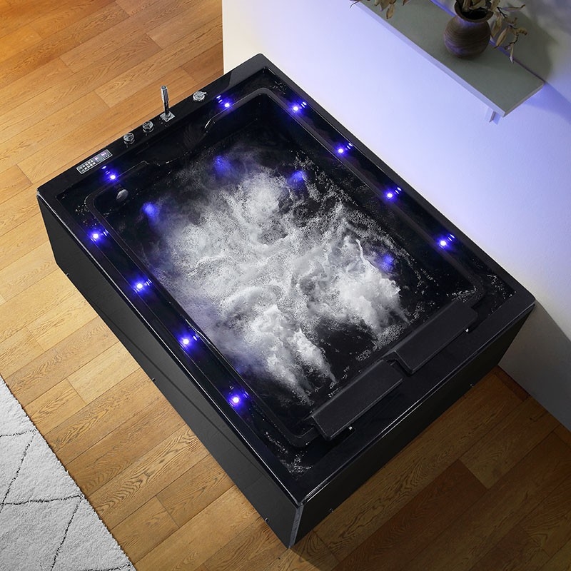 La chromothérapie LED à 16 couleurs et la cascade multicolore créent une ambiance sensorielle raffinée, complétée par la radio FM, le Bluetooth®, et le générateur d’ozone pour une eau pure et sans entretien. La cuve en acrylique noir brillant, posée sur un châssis métallique avec 3 tabliers noirs, assure stabilité et durabilité conformes aux normes CE.