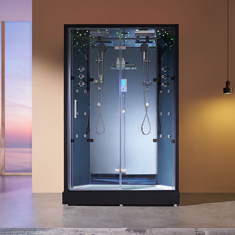 Deux zones de jets hydromassants et deux douchettes Hansgrohe® permettent à chacun de profiter d’un massage relaxant et personnalisé. Le générateur vapeur de 4,5 kW chauffe rapidement et diffuse une vapeur dense et homogène dans tout le volume. La chromothérapie LED et la sonorisation Bluetooth/FM viennent compléter l’expérience par la lumière et la musique.