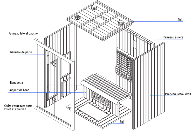 - Télécommande : permet d'allumer / éteindre et régler toutes les fonctions du sauna