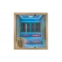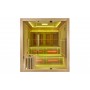 Côté Finitions Exclusives : Banc ergonomique en cèdre rouge du Canada, dossiers ergonomiques intégrés en cèdre rouge du Canada, double chromothérapie (Carré LED sur le Toit + éclairage LED indirect inséré dans le double toit de la cabine) avec choix des couleurs ou défilement, structure en cœur de Western Hemlock Canadien, console digitale avec bluetooth, MP3, radio FM, réglage du temps et de la température des infrarouges, avec réglage rapide d'intensité des émetteurs de 70 à 100%.